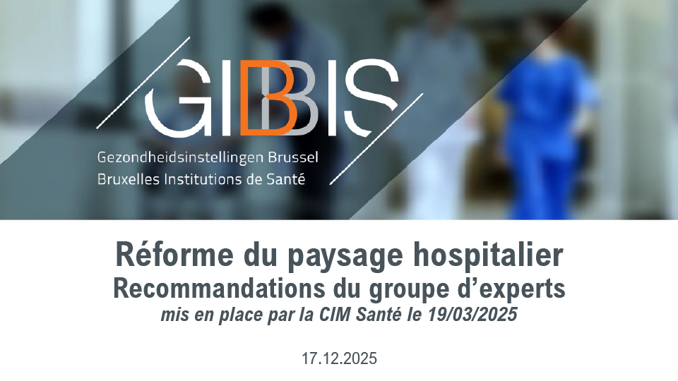 Le rapport, qui compte 79 pages, formule des propositions stratégiques concernant l’organisation des soins hospitaliers, les réseaux de soins et l’aide médicale urgente, avec une perspective à long terme jusqu’en 2036. Afin de rendre les principales lignes de force plus accessibles, GIBBIS en a synthétisé les éléments clés dans un résumé de 16 slides.